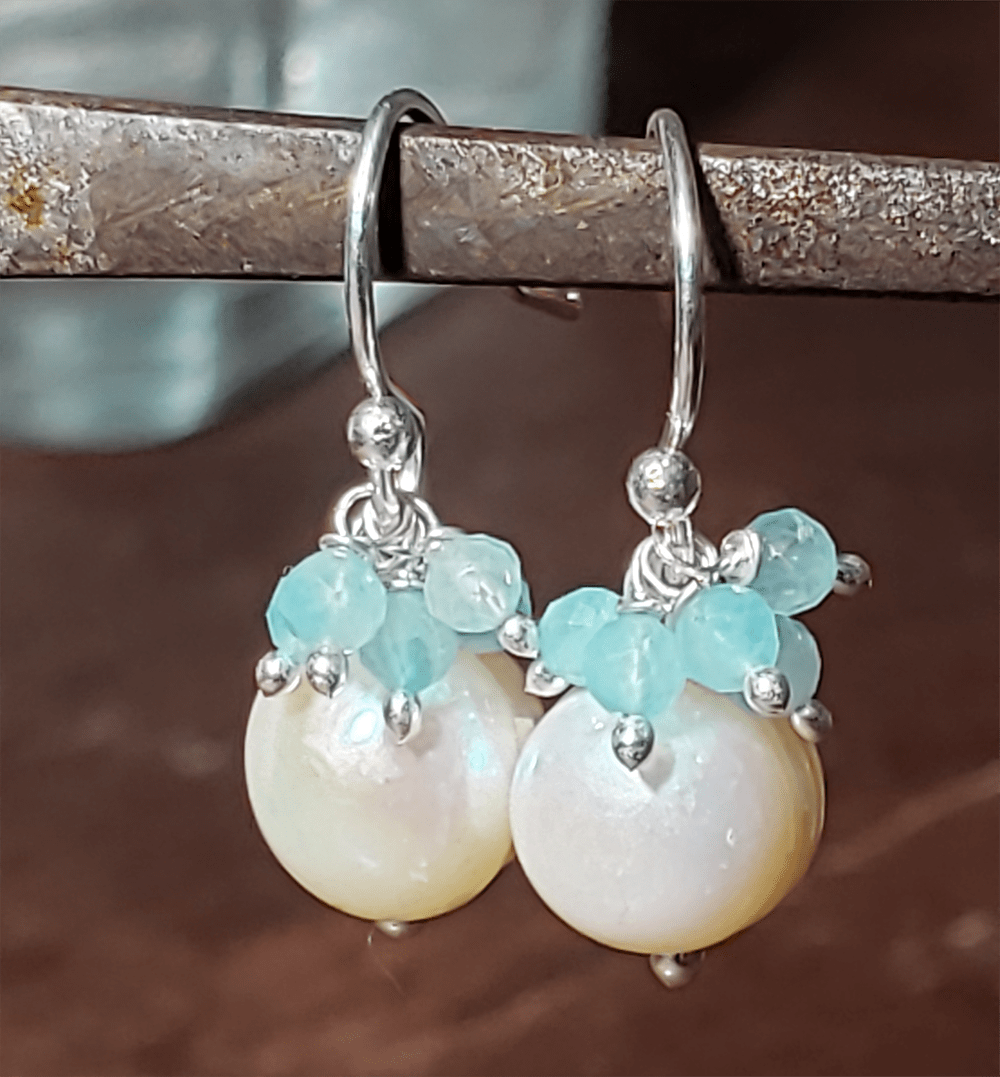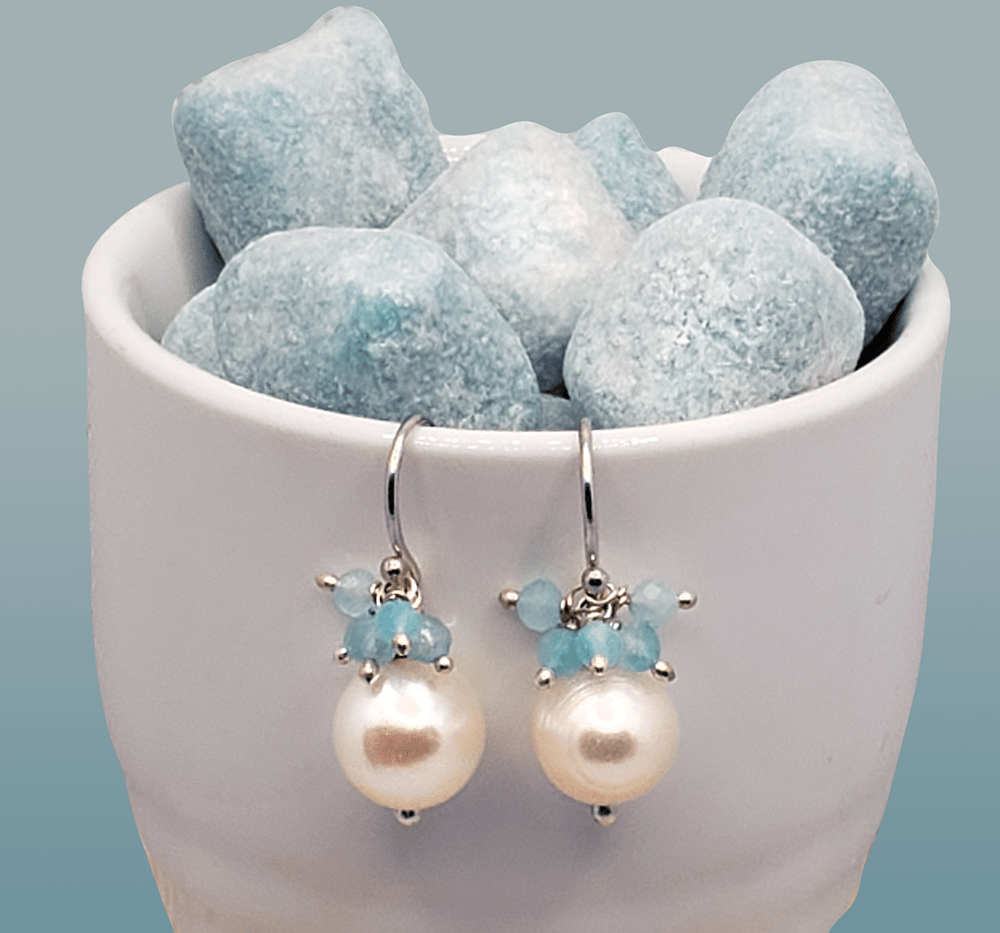 The “Cutie Cute” collection presents a pair of Drop pearl Earrings with 8mm white freshwater pearls and 5 x 2mm faceted round aquamarines.