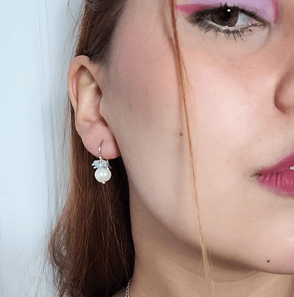 Drop earrings have 8mm freshwater pearl with 5 aquamarines of 2mm each. The earrings are made of 925 silver and come with a beautiful jewelry box.