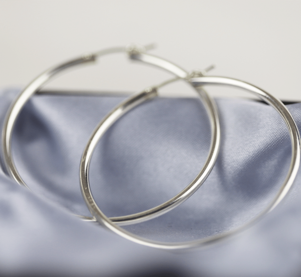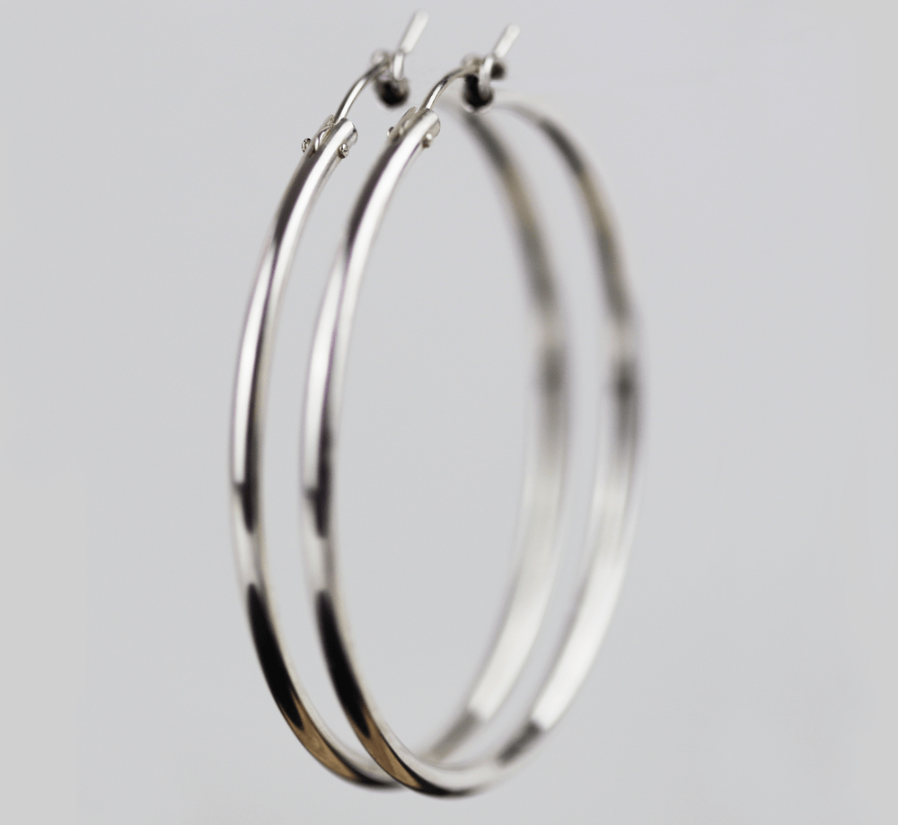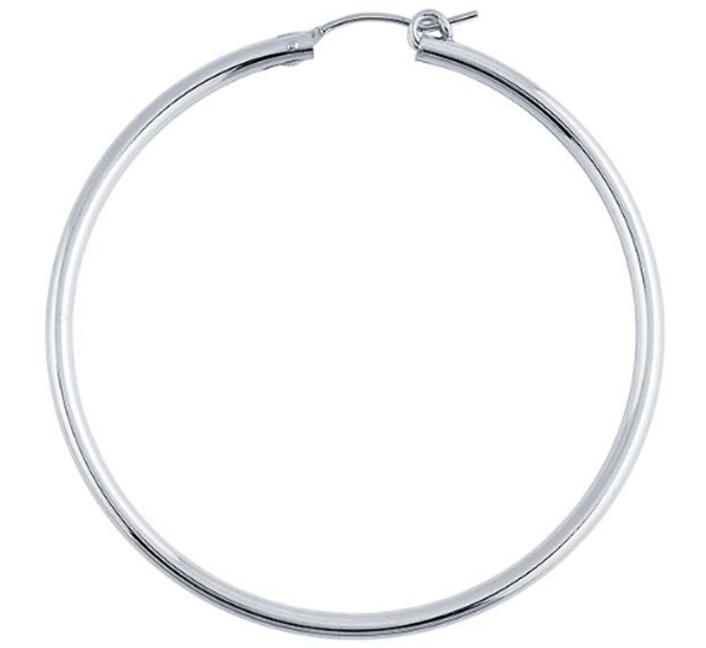 These 35mm -dia. sterling silver hoop earrings are lightweight and comfortable to wear. The hinged post simply clicks securely into the catch to create a fast, easy-to-use closure. Hoop earrings circle the ear from front to back and offer a wide variety of design options—they look great as-is or are ideal for attaching drop and dangle designs. Fine-silver plating offers a brilliant bright finish and helps protect against tarnish.