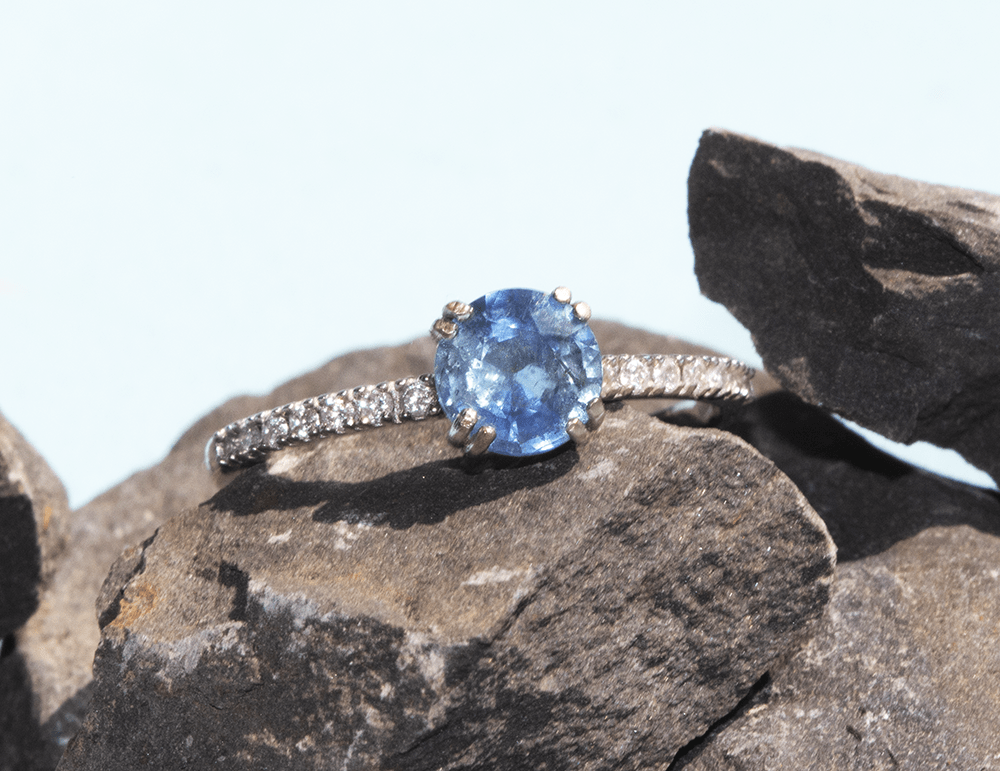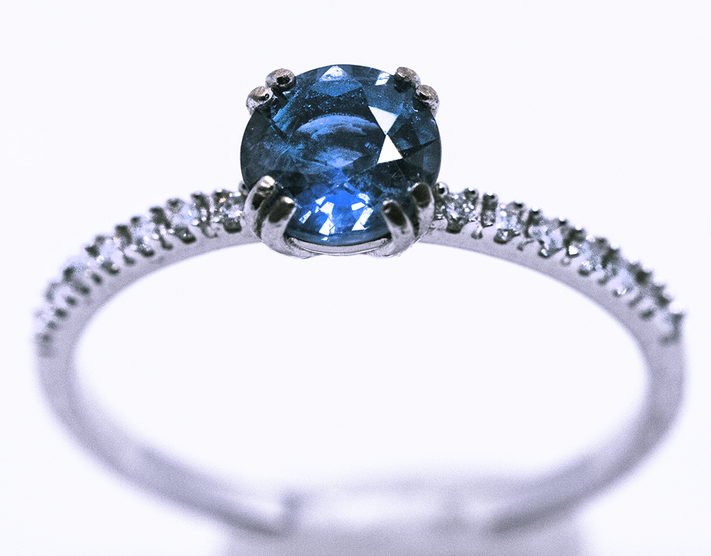 This is a 14-karat white gold ring with one .85-ct. (6mm, approx.) round faceted natural blue sapphire stone. The band is set with 14 1-pt. round diamonds (I1 clarity/G, H color; 14 pts. TW), with seven on each side of the stone, in individual 4-prong mounts.