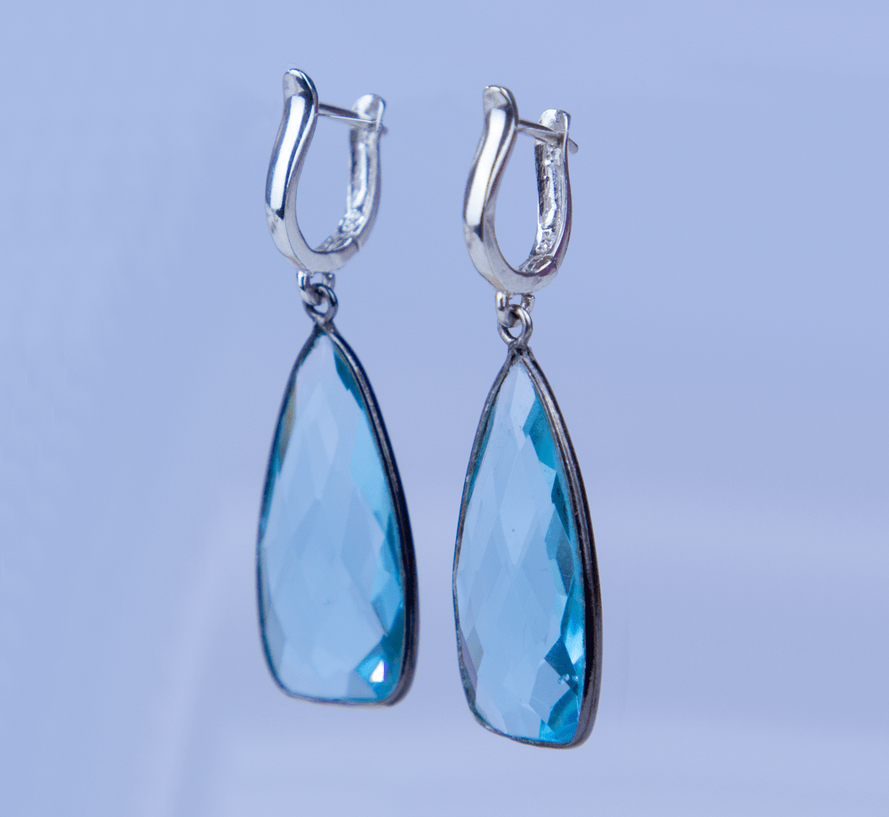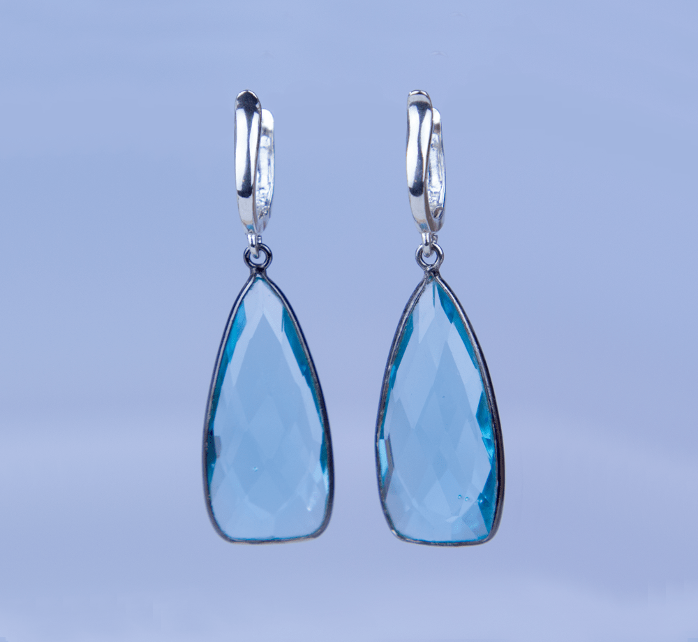 Our Blue topaz drop tear earrings are part of The Selvatico Collection. The hoops are 925 Sterling Silver with cross detail. This piece is very alluring jewelry and speaks to authentic personalities.